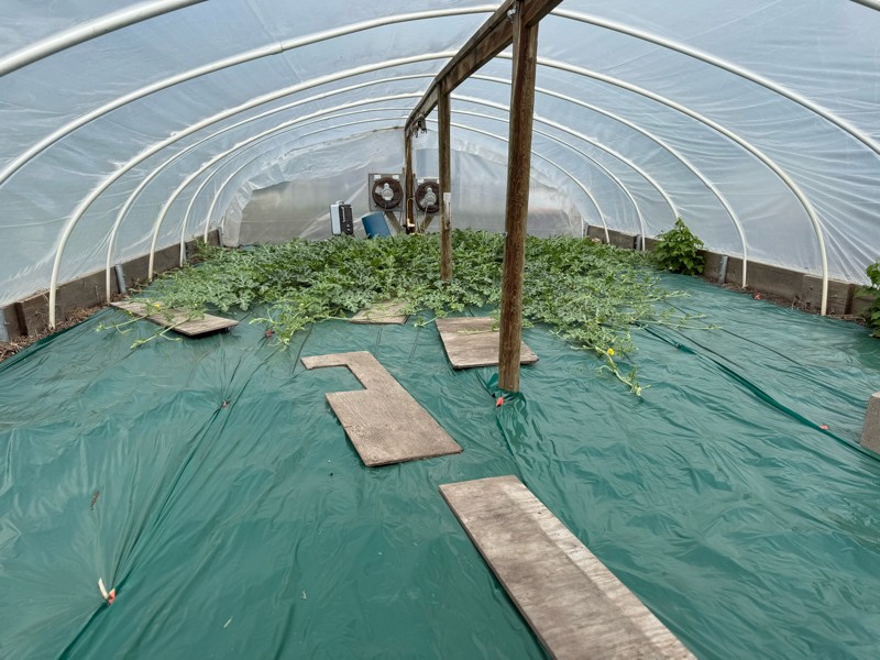The 162 black diamond watermelon is doing well. Have potential pollination on the main and if you look close you can see one on a secondary.