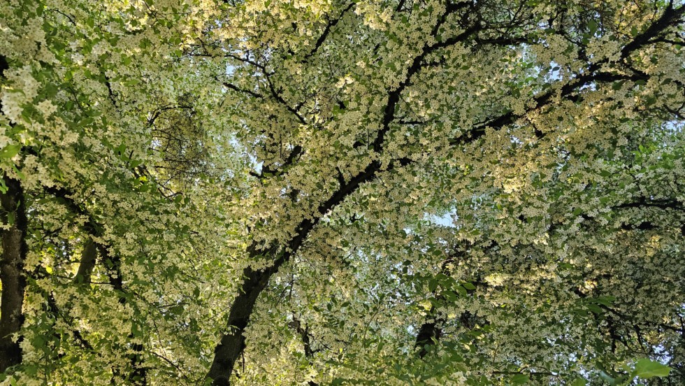 Our amazing Japenese Snowbell tree. Zoom in as it almost looks like a blurry picture. The whole 40 ft tall tree is one ball of small perfumy flowers....millions !