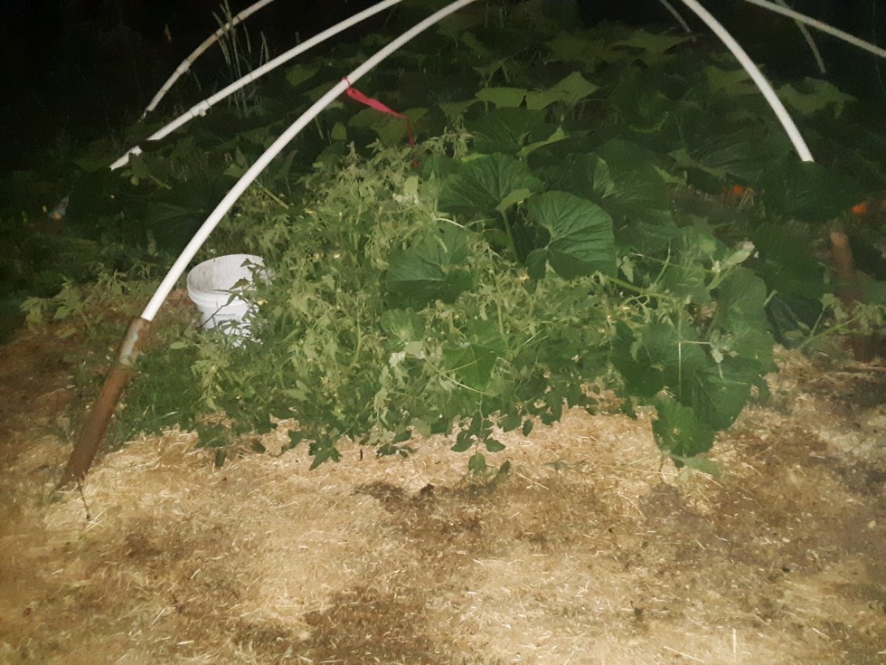 The overwintered tomato thinks its a pumpkin plant. Its measures 8 ft from side to side. Might be a 150 sq ft tomato plant by the end of the year... this will not necessarily translate into a big tomato, however.