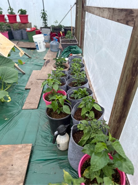 Peppers in the greenhouse. Superhots and some habanero/scotch bonnets