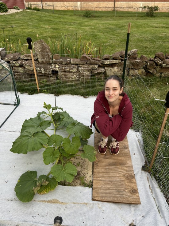 My girlfriend Kenzie with our 1461 Rodebaugh (Ruby). it's being grown in a 150 patch and is a genetic freak. She started off double/triple vined and has only started to grow a real vine, albeit in the wrong direction. I just want a pretty pumpkin for her family's halloween display and to participate in the 150 challenge.