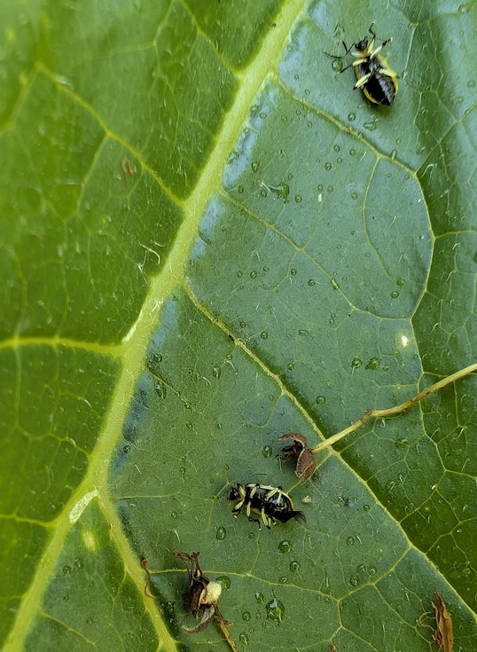 I guess the permethrin or malathion or imidacloprid is working (maybe its the imidacloprid since there are also dead cb's in a newly opened flower that was never sprayed). I'm trying to remove any excess male flowers before they open so honey bees don't get to them and get a dose of imidacloprid. Expecting mid to upper 90's this coming week, thinking of ways to protect the plants (sprinkler all day? canopy? light cloth covering? OTT on the first 656 Domke pumpkin pollinated is 41 at 7 DAP.