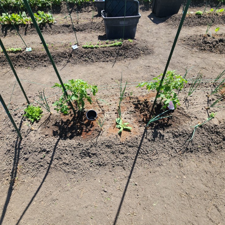 Two Zacks growing well. Borage and onions were companion planted. This year, most everything was started from seeds. Tomatoes are on a new truss system I'm trying out. On the ends, I planted sweet Williams from seeds and the transplanted into my plot 153.