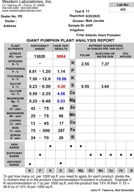 This represents the "best" tissue test to date. I'll be foliar spraying Epsom Salt at 300ppm (13% sulfur) till I find a better way to have the plant absorb sulfur. Every tissue test I've ever done has been flagged for low Sulfur