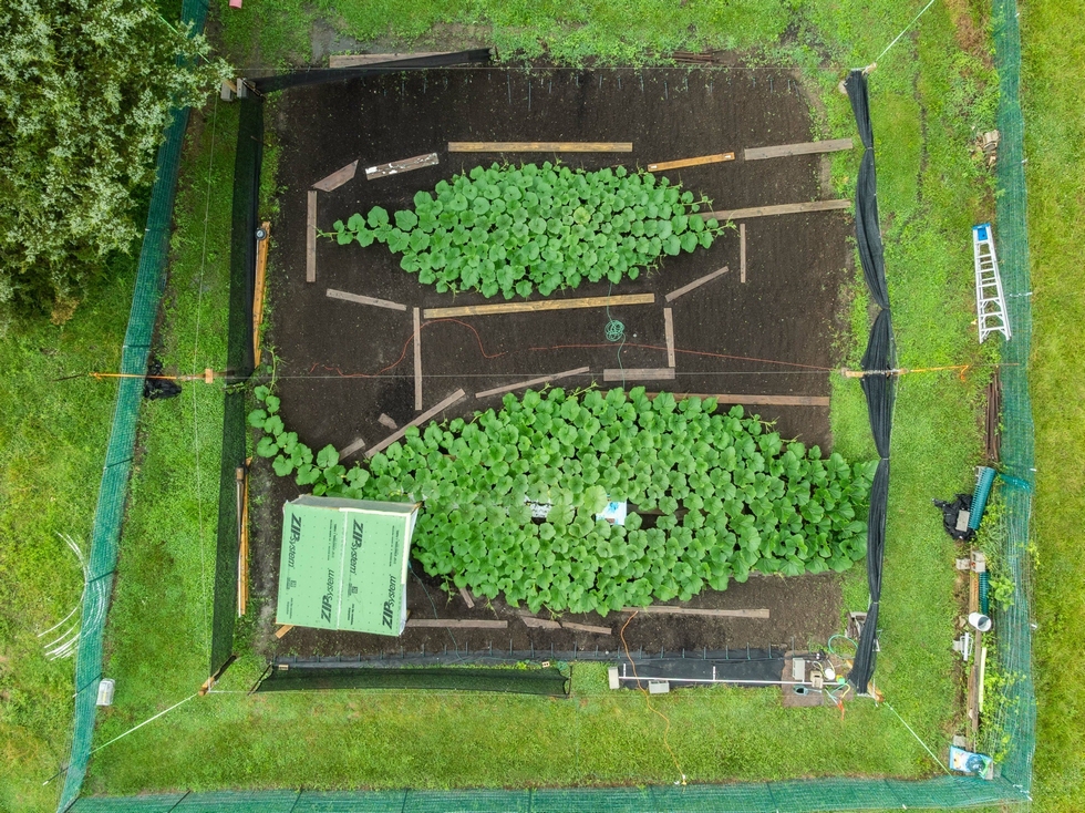 Overhead view of the patch from 2 days ago, all was going pretty well. The rain has washed out most of the nitrogen, and I haven't been able to add much back with continued rain. Pumpkin on the 2006 is growing well so far, and I built a small shed around to block the weather. Then last night a strong storm came through and rolled several vines and I lost some of the larger leaves and ends of the vines. It's just a constant battle with the weather here in Missouri