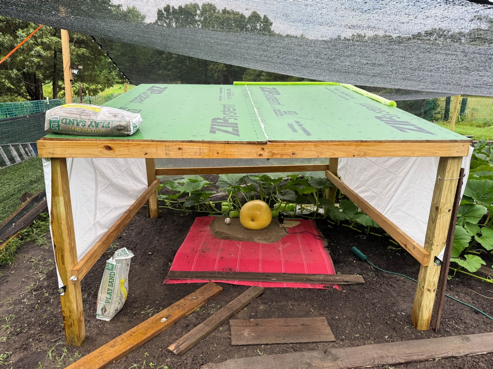 This is the pumpkin shelter I put up the weekend. It's 8 ft x 8 ft, and staked into the ground. A tarp/ PVC pipe shelter would never hold up to the storms we have had even with two layers of wind block.
