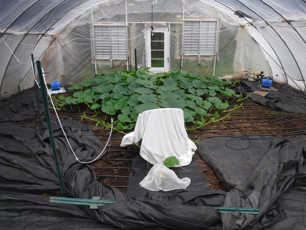 This shows what the plant looks like and early secondary vines will be terminated soon. Two "Henry Fans" (carpet/floor fans that were recommended by "Henry-the giant pumpkin grower" here in bigpumpkins.com) have been added to help keep air moving inside the structure. There is also CO2 being added so these fans help ensure an even mixing of CO2 and temperature in the growing area. These are only run during the day when air circulation is needed the most