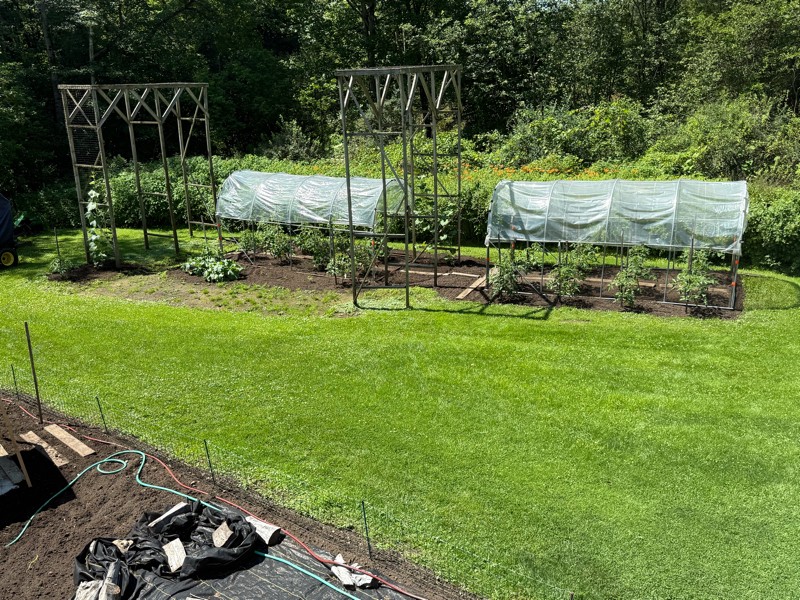 The tomato and long gourd patch is starting to fill in.