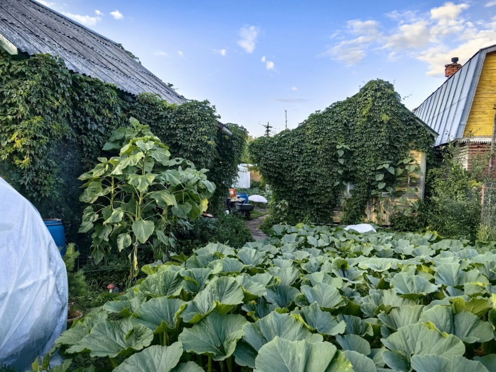 This season is very difficult. The weather has set several temperature records, as the coldest June in the Moscow region in 100 years. It's going to be 39 degrees Fahrenheit tonight, and there have been a lot of nights like this. That's why all my pumpkins look useless in the open ground. There are many green leaves, but the fruits hardly grow. But in the greenhouse everything is different, I decided that I need to heat it. I've already used up 1,000 liters of propan to heat the greenhouse, and it's paid off. My pumpkins are as big as they've ever been at the beginning of July.