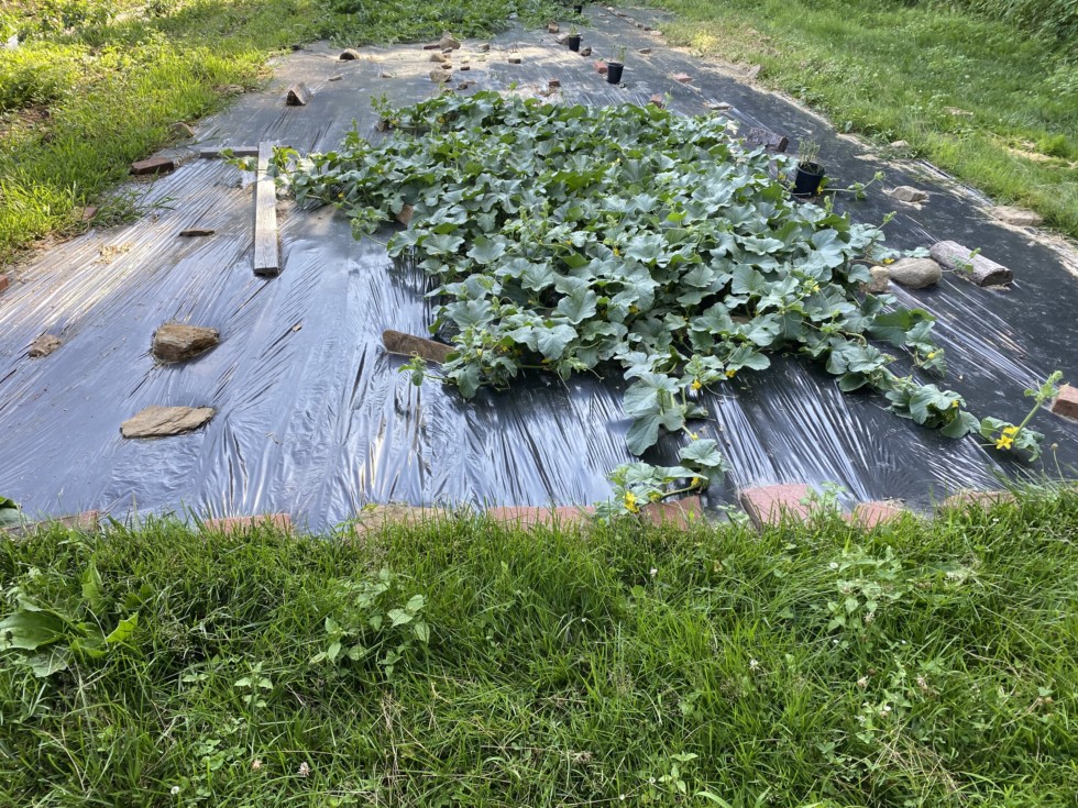 56.2 English cantaloupe. I started with three. Two were grafted onto Kiwanis melon. The rootstock was not compatible. They just fell apart when the plant was about about six feet in diameter. The one that is in the photo is on its own roots. The plant is huge but I still don't have a melon set yet. I was hoping the bees would take care of it for me. Nothing yet.I have not seen many females yet.