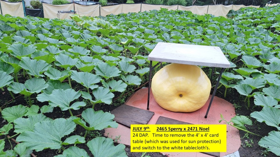 All 4 pumpkins were shaded with 4' x 4' card tables with white cloth draped over it for a few weeks, for sun protection. The pumpkins are starting to outgrow these shelters so its time to switch to my 90" diameter white table-cloths for the next 3 1/2 months.