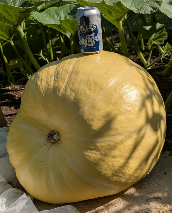 The 656 Domke pumpkin pictured at 21 DAP, OTT 136, estimated 63 lbs. Gained 11 lb the prior 24 hr. But as of 09-Jul it has only gained an average of about 8-9 lb each of the last few days. I'm starting to prune this plant back to give room for the 1526 Miller to spread, hoping that plant produces the bigger fruit. I'll leave the Domke pumpkin on, just hoping it gets to maturity to produce some seeds and a decent jack-o-lantern.