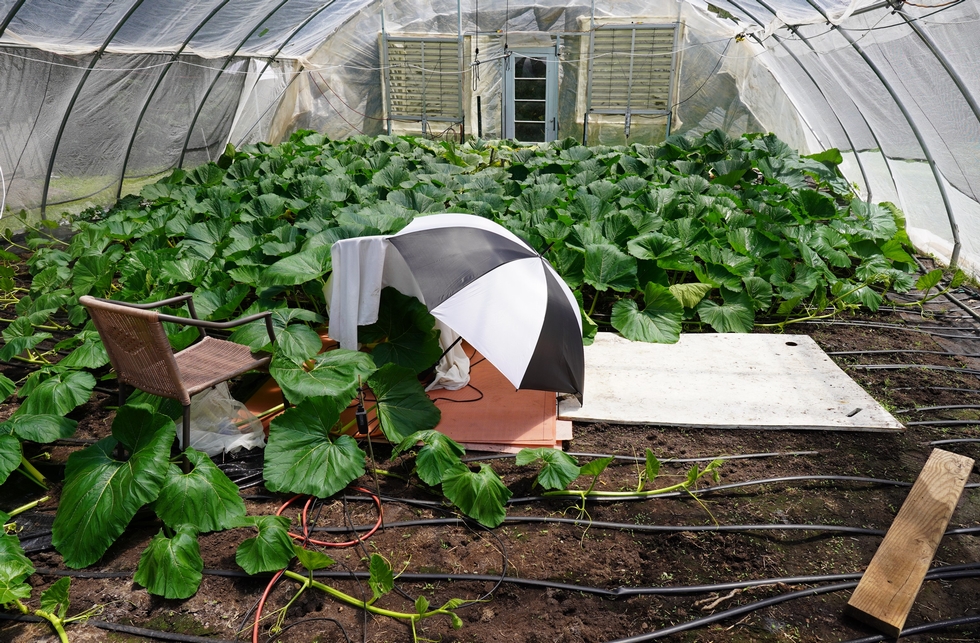 Overall, the plant looks very good considering the extreme heat. There is a chair with a white sheet over the pumpkin (day 11) and the extra addition of an umbrella to reduce the direct sun rays even more in the area of the pumpkin. The hope is that these preventive measures will reduce the chance of the pumpkin aborting.