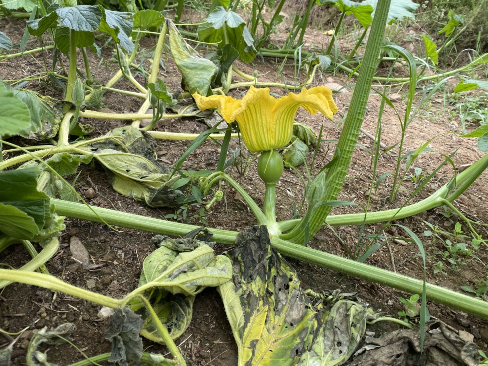 It's go time with the 1203 mace squash project. The dead leaves in the photo are from a plant that I pulled because it was a pumpkin. I didn't bother to fish out all the dead vines when I culled. These plants were a tangled mess!! Out of some 20 plus 1203 plants I have culled down to the four best and only the darkest green squash. Now it's time to let the bees do their thing. (This plot is isolated from all other cucurbita maximas.)