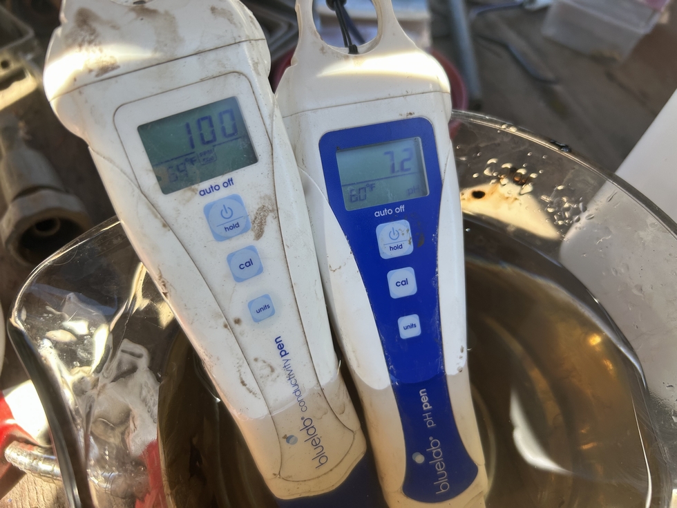 Then I let it mix together in the vat for a while and take another sample. As you can see the pH has dropped to 7.2 (anything between 6.8 to 7.2 is good). The other meter shows that it is 100 ppm, which is quite low. I know that my soil is balanced & full of nutrients. Over the course of the next month I will ramp this up to 1500 ppm, as I know that the reserves in the soil will start to be used up. Around the first of August I will replace the 12-4-12 with 0-0-25. That is what I've been feeding. It is not a lot! I rely on getting my soil right before the season begins, and then I supplementing.
