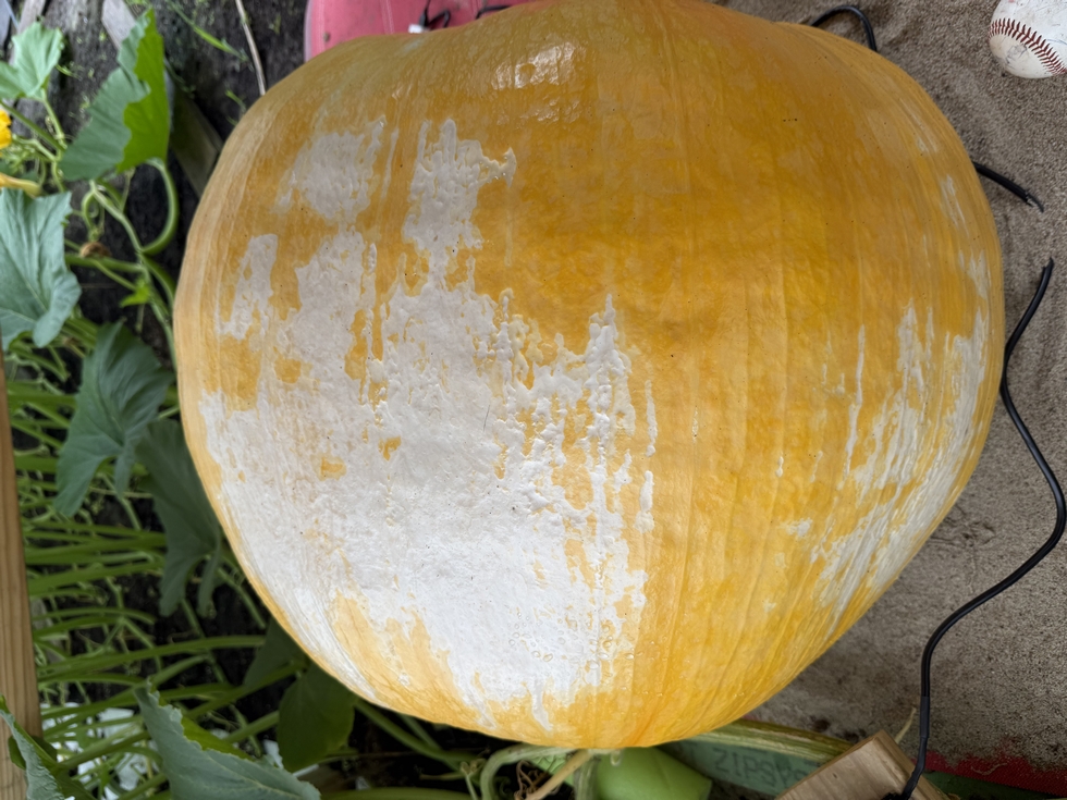 Took the family on vacation for a week and came back to this. Split in the stem as well with some rot setting in. Had a lot of rain while we were gone and broken vines and leaves. The pumpkin was kept dry and with a fan on the stem and another fan on the blossom, but none of that matters now. I'll see if I can get something on a secondary, but I think next year I'll plant green beans instead