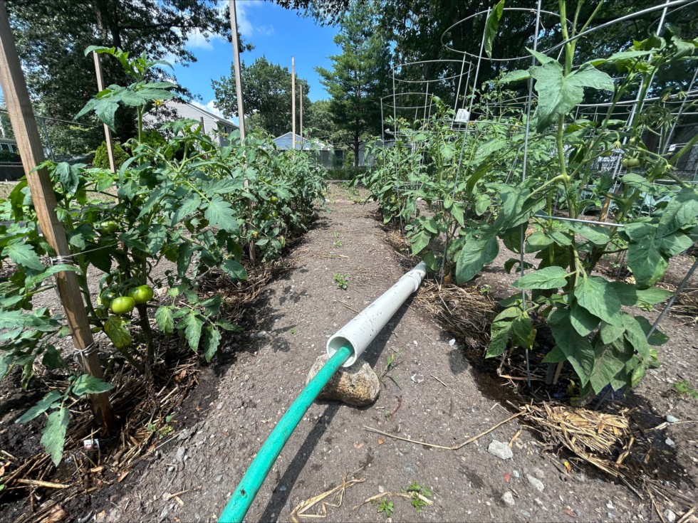 Trench watering. Celebrities on the left and Brandywines on the right. The soil in these gardens really dries out quickly and we get a ton of sun throughout the day. We think the trench watering is a big part of the productivity that we see from the veggie garden.