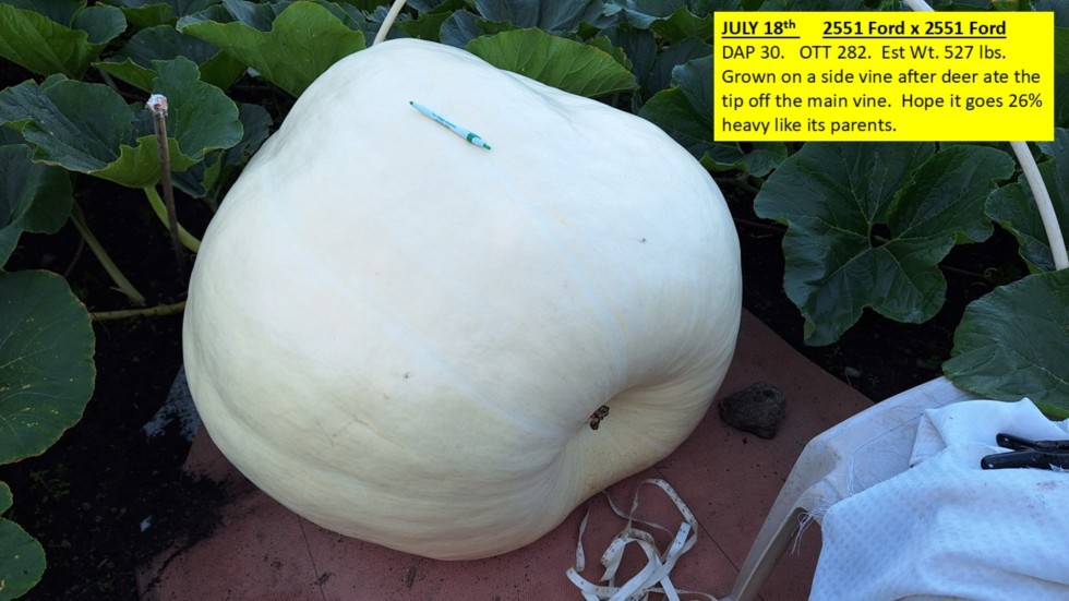 My 2551 Ford "Side Vine special" has finally reached DAP 30. After the Deer ate the end of the main off, vine back in May. Its a decent 527 lbs. and good shape. Still a very young looking pumpkin and surface is smooth as a baby's bottom.
