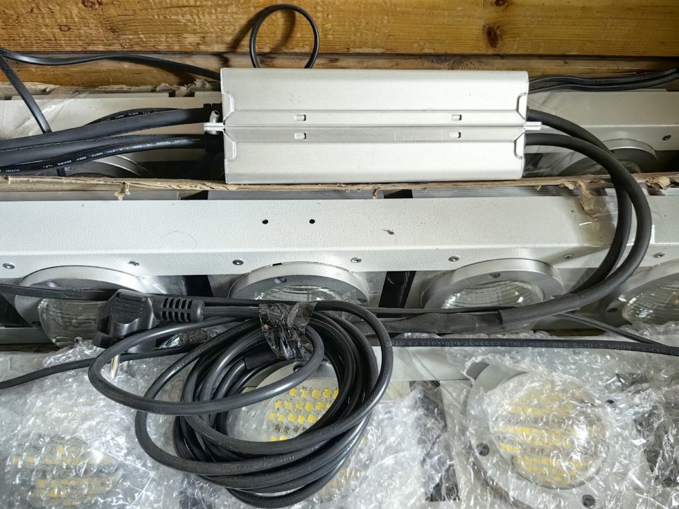 I have some grow lights that are used in professional greenhouses. There are 10 of them in total, with a total power of 5000 watts. I won't be able to hang them this season, but I think it would be great to try installing them over a single pumpkin in the future.