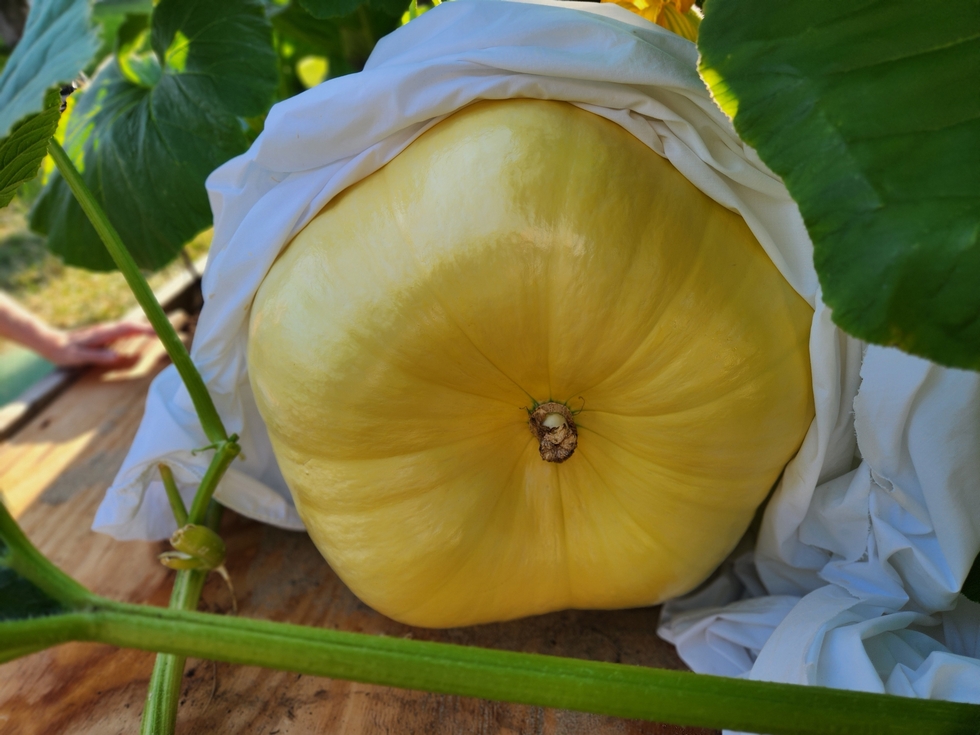Here are two new pictures of my 150 sf pumpkin today. It's going to be a hot day with high humidity tomorrow so rather than trimming back all the nearest leaves I decided to leave them for another day to hopefully help with some shade. The pumpkin is 15 DAP.