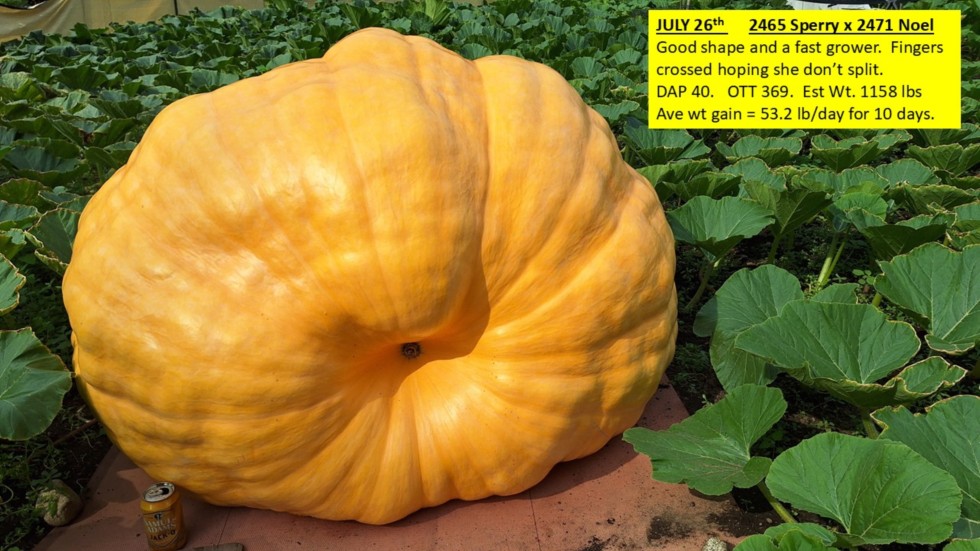 The 2465 Sperry x 2471 Noel, has a fairly nice shape and color for such a young pumpkin. At 40 days after pollination she's taping 369 which is an 1156 lbs...est weight. Averaged 53.2 lbs per day, for the last 10 days.