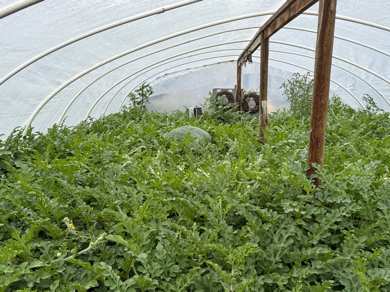 The May 29 pollination on the 162 Crews JBD is sitting in a bunch of vines. Looks fat.