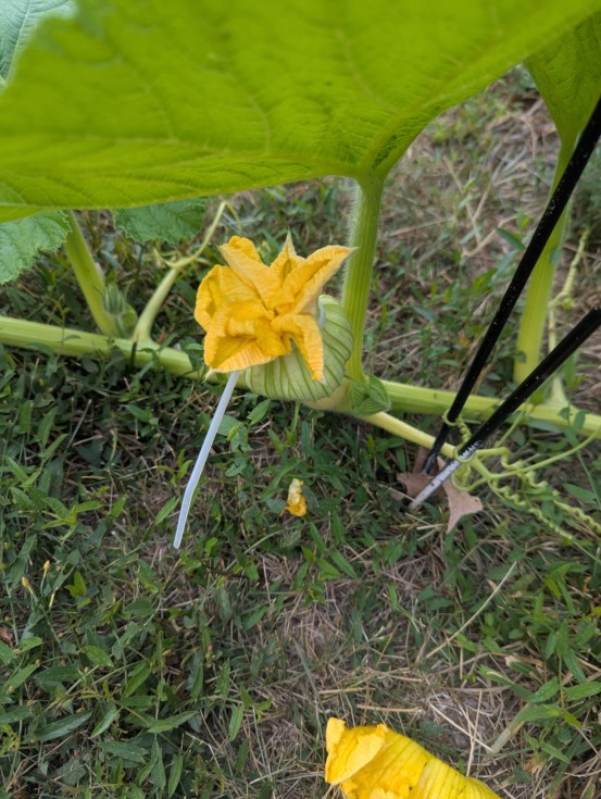 We are a bit slow getting it to pollination length but the flower was the best looking one yet on the plant in the perfect spot. Brad was nice enough to donate some pollen from his plant. Thanks Brad. <3 . We usually let it grow across the grass and get a 150-200 pound random pumpkin. This year she is growing in last year's tomato area. Our house shades it in the afternoon during the hottest part of the day. It seems to be working quite well. 1,463 Gross x 2560 Gienger.