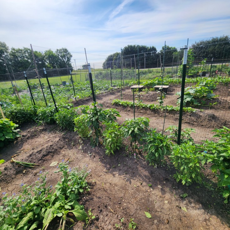 Showing a picture of my 2nd plot. In there, I have butternut squash, watermelon, pumpkin, corn, sunflower, dill, beets, carrots, raddish cukes, purple basil, marigold and aster. Right along those stakes in my 2nd plot are my "blister family" peppers. This side of the fence are the medium scoville unit peppers