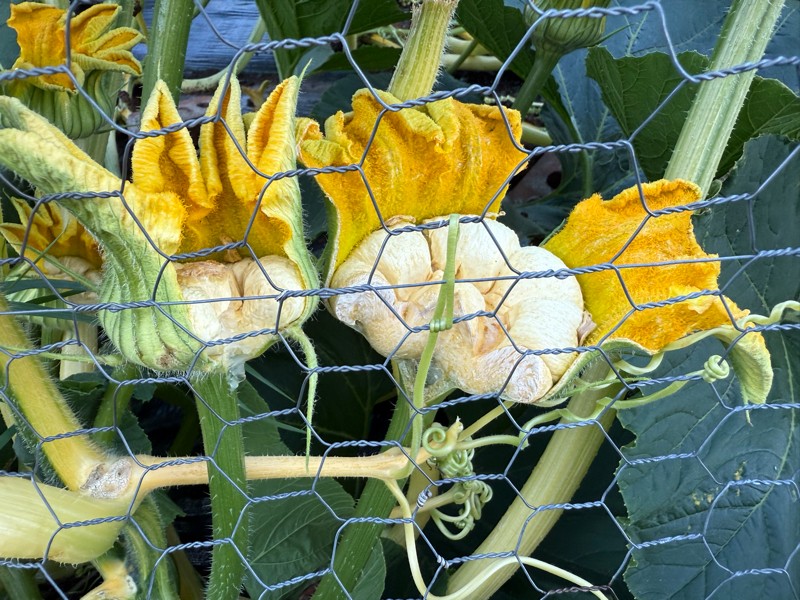Cutting off the vines on a pumpkin plant cause a real hormone imbalance a few days later. Look at these male flowers today.