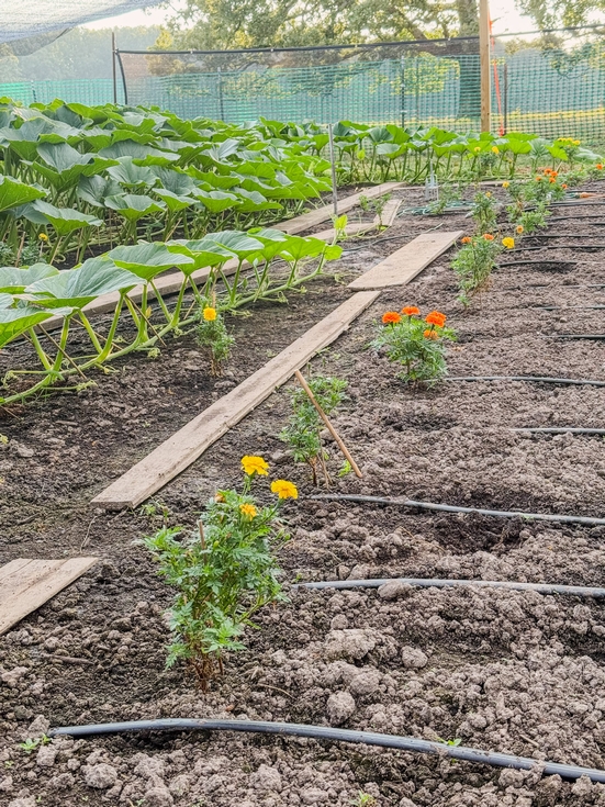 Since I'm down one plant, I added in some marigolds around the perimeter. Maybe this will help keep some pests away, while adding some color to the patch.
