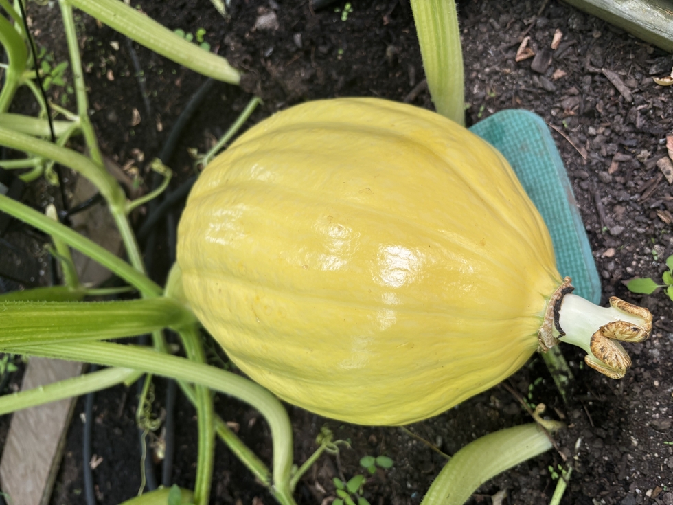Here's my pumpkin that is 12 DAP. I do have another one, but lost a previous one on the main. These two are on secondaries. Plant is only 160 sq ft. We will see what happens.