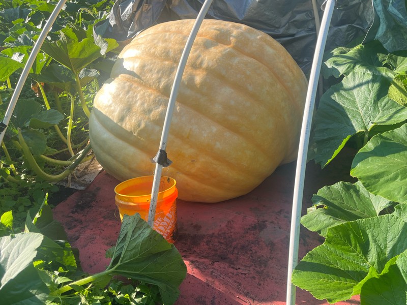 The 839 has gotten the most attention and the results are showing. Although I didn't do a very good job of the angle of the pumpkin as it's hard now to get in there to measure and keep an eye on. I may need to pull it back a bit to avoid some vine stress. It's nice looking pumpkin albeit the blossom starting to grow over itself.