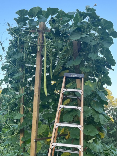 My long gourd trellis has a few hanging.