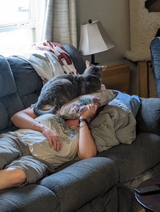 As I was getting the seeds out my the tomatoes my wife had a migraine and was hiding from the light and smells. Well of course her cat can sense distress and decided to make it better by sitting on her head! :)