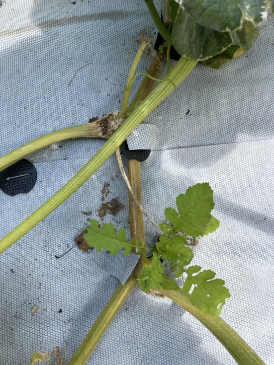 Matt came over today to check out the patch and we noticed a vine that had started to rot. The rest of the plant was totally rot free so this seemed really strange. I went to check out the area and noticed a big lump under the fabric.