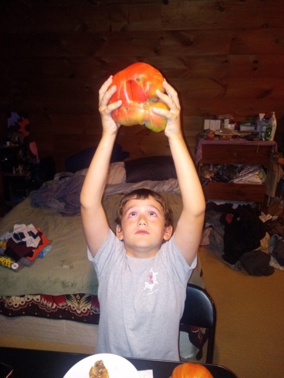 My 8 year old son Mason and the 3 pounder we grew this season.