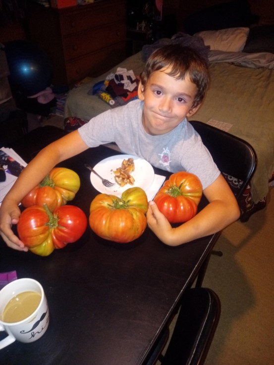 Here's Mason with the giants off the 5.19 Whitty tomato seed.