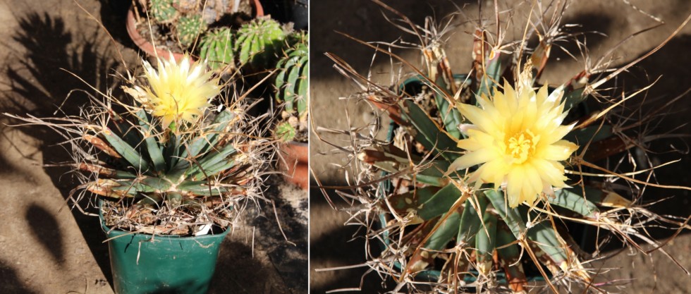 My Leuchtenbergia principis, more than 30 years old this little bugger and producing some sporadic flowers year by year. This is the 2nd flower this year (and another flower bud is still hidden in the top).