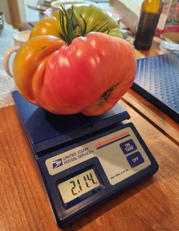 This is my biggest tomato so far in 2025. Growing tomatoes in containers works great for casual gardening but I think the 1.5 cu ft just isn't large enough to grow them large. I grew a sunflower in a 30 gal grow bag this year, but it became root bound capping the height at 12'. The head on the sunflower is 11.5" and its grown 2" in 5 days.