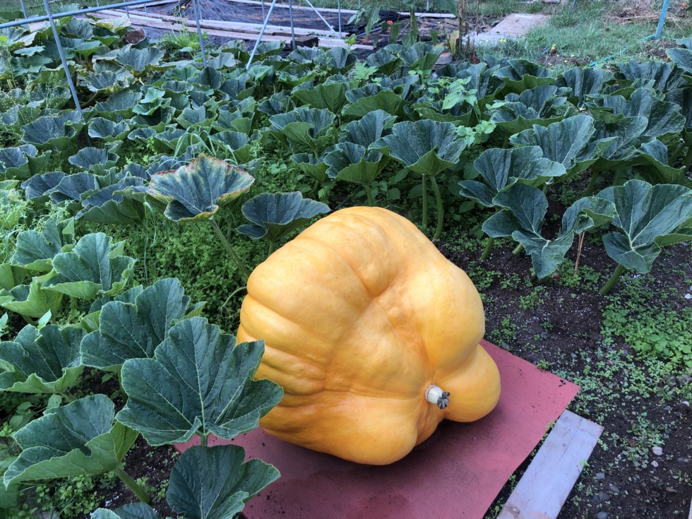 The monkey butt pumpkin continues to grow slowly like everything else this year.