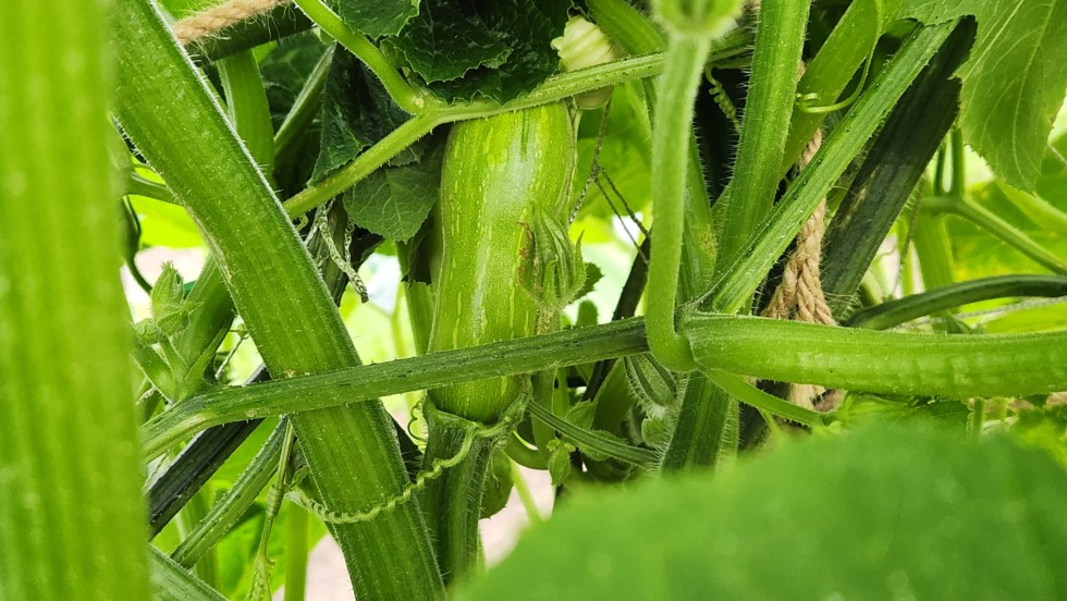My 1st baby butternut on the vertical trellis. This plant is way over my head even with lots of thise squash bugs visiting.