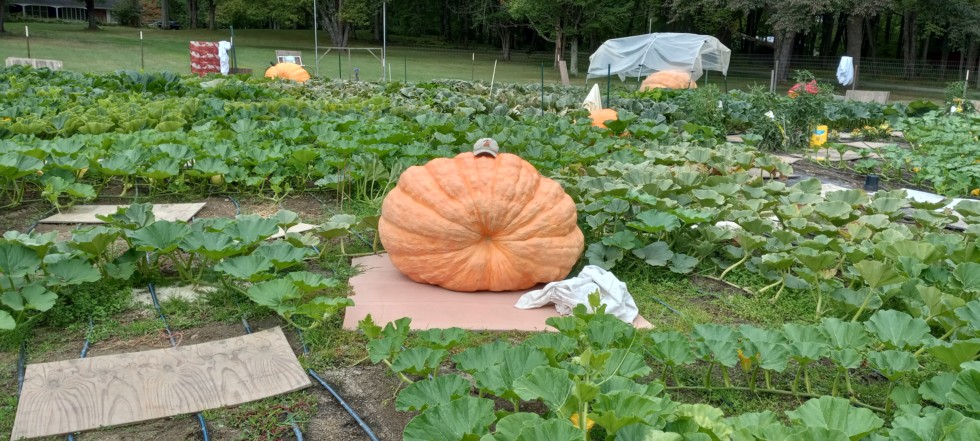 This is a fruit I have not shown yet. It's the 2369 Werner. It was an open pollination on the main vine that I ended up keeping because of issue getting another one pollinated. It never grew good at all because I was too wet earlier in the season, and nutrients were washed out and out of balance. It will likely end up around 900 #. I also set one on a side vine in the next pic. I used this plant to pollinate my 839 fruit.
