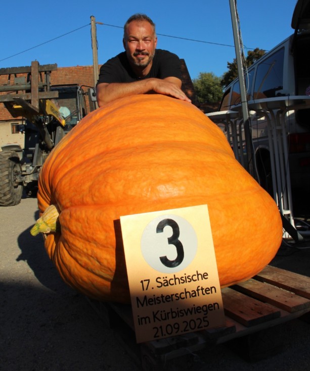 So, it is what it is...and it was a positive surprise. This is my fruit off the 2064.2 Baumert plant (x open), and in the context of the overall situation (weather hasn't been summer-like at all, and the plant had made the impression that it could be sterile because of the various strange things it did...like female flowers opening at 6 p.m., male flowers having almost no pollen, the plant producing the tallest and largest salad in the patch) I am happy that the fruit eventually grew into a nicely colored and pumpkin-shaped pumpkin. Now, this is my 765.4 Wagler, it came in 3rd place at the weigh-off in Goerlitz/Ludwigsdorf. A BIG ThankYou to the weigh-off team, it was a fun day (as usual), and again they had booked sunny summer weather for that event ;)