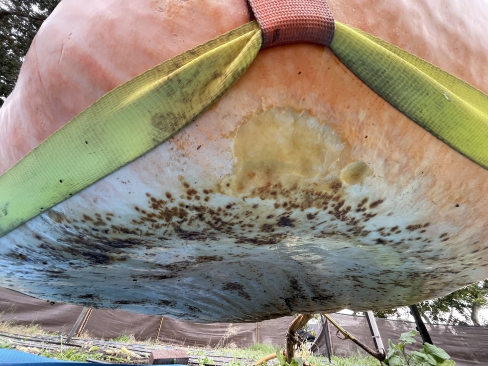 To my relief the spot was very shallow. I scraped it with a spoon, sprayed it with hydrogen peroxide and set it on a pallet with a fan. Should be able to get a weight and hang out with all the other pumpkin folks this weekend. Phew!