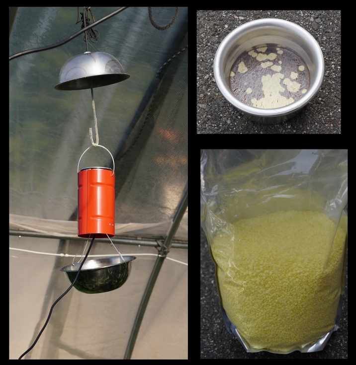 The image shows the red burner that has a 100-watt ceramic heat bulb in it which will take the 99.9% High Purity Sulfur Prill pellets and turn them into a liquid that a small portion will vaporize off from. A metal protective bowl has been added above and below the burner to catch any potential liquid sulfur that may splash out during the heating process. The hope is by the morning the container that contains the sulfur will look like it does in the upper right-hand image. When this is seen, this demonstrates the solidification of the sulfur after the liquidation and vaporization process. It seems the sulfur can start out as brown in the early morning and then progress to its more traditional yellow coloration.