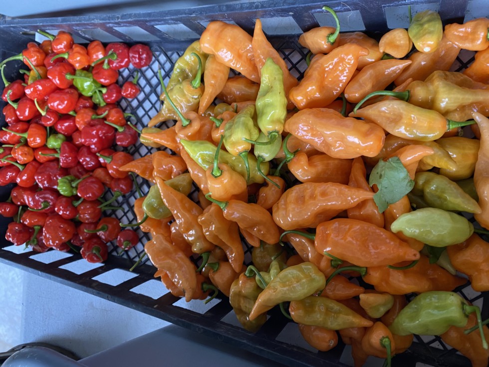 The peppers in this photo look rather intimidating something you wouldn't want to try and just pop in your mouth yet looks can be deceiving. The orange ones are called habanada it's a no heat habanero and the red ones are called sweet bonnet. It's also A no heat pepper.