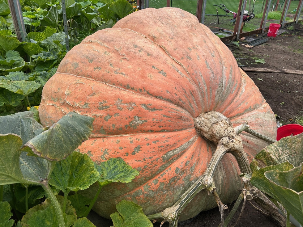 Next up is the PGVG club contest at Bauman's Farm this Saturday. This is the fruit I'm calling Cracker which is growing on my 2301 Pugh plant. This plant & pumpkin didn't receive the deluxe treatment that Hope & Fordzilla enjoyed. At one point Cracker was nearly culled. Now it is a beast!