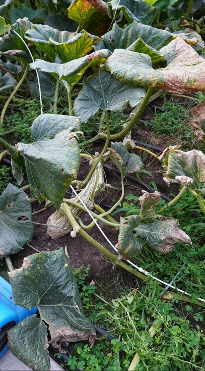 In the preparation for harvest, I wanted to document the oldest portion of the plant (the crown) just to see how good it still looked even after growing a 110-day old pumpkin. While the leaves are brittle and aged, the simple fact that there are still green leaves present shows to the overall plant health and performance.