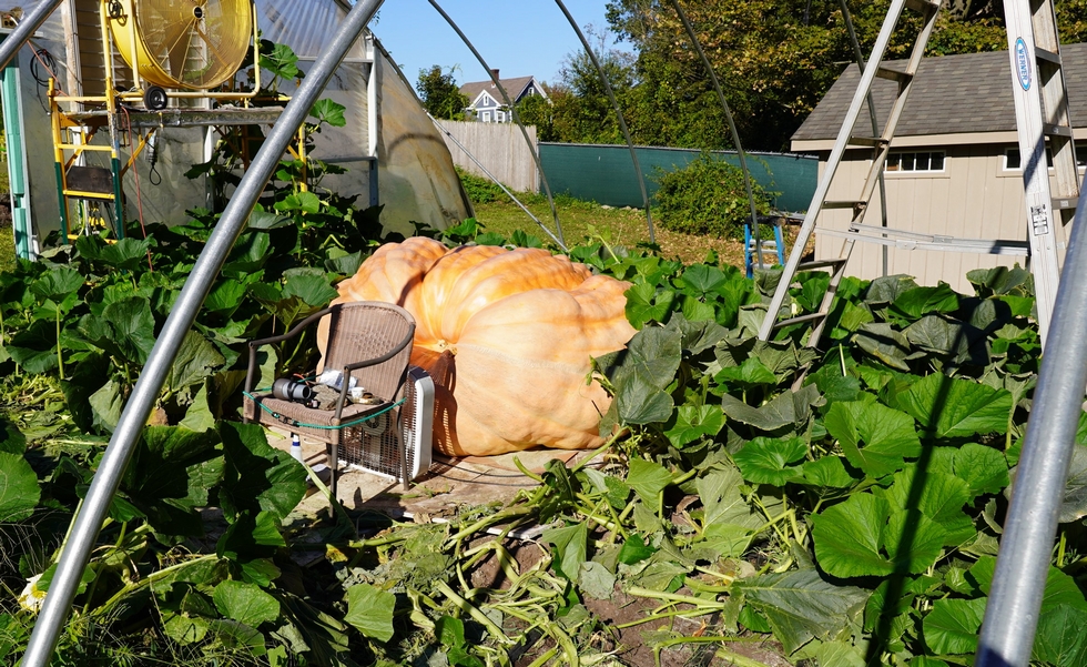It has been hard to get a good image of the pumpkin in the patch due to the width and the limitations on how far back I could get due to the structure. This is an attempt to show the pumpkin in the patch from a new angle that was not previously possible since the plastic has now been removed.