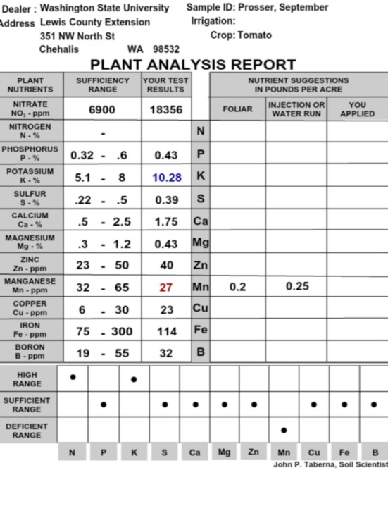 Low production, and not big tomatoes. Very healthy plants. It seems less likely that it was a deficiency and more likely that it was excess nitrate. Manganese is very important but I think the excess nitrate was the bigger issue. Not sure I trust these tests entirely. They are not as straightforward as they would seem. For growing normal crops, the normal range is ok but for giants I bet for certain minerals more would be better. Except nirate. Thats just way too many ppm's and I think it messed the fruit up.